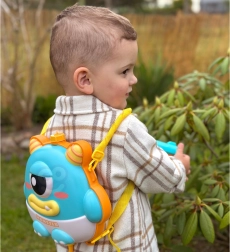Roztomilý batôžok s motívom príšerky a ľahká pištoľ prepojená hadičkou tvoria ideálny set na horúce dni na záhrade, pri vode alebo na dovolenke. Veľká nádrž 2,1 litra predlžuje hru, zatiaľ čo nastaviteľná tryska umožní prepínať medzi rozprašovačom a silným prúdom. Vďaka nabíjacej batérii nie je potrebné pumpovanie – stačí nabiť, zamieriť a striekať.