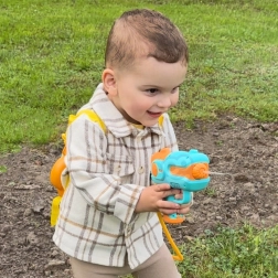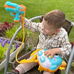 Bezpečné a zábavné prevedenie je vhodné pre deti od 3 rokov. Nastaviteľné popruhy batôžka sa prispôsobia rôznym postavám a ľahká konštrukcia uľahčuje nosenie aj dlhšie hranie. Dosah 5–8 m zaručí akčné vodné súboje a veľa smiechu.