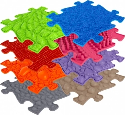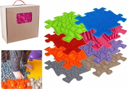 Senzorická ortopedická podložka skladaná ako puzzle má povrchy s rôznymi tvrdosťami a štruktúrami, ktoré sa dokonale dopĺňajú. Tvrdé prvky, ako sú kužele a mušle, stimulujú a posilňujú klenbu nohy, zatiaľ čo väčšie kamene pomáhajú zaťažiť svaly nohy a trénovať vnímanie rôznych povrchov. Mäkké povrchy ako tráva a oceánske vlny slúžia ako príprava alebo uvoľnenie.