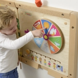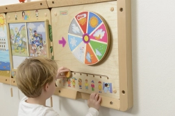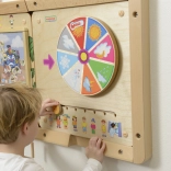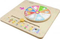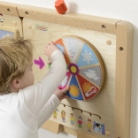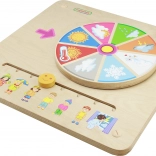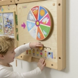 Pomocou otočného kolesa a posuvníka na tabuli deti môžu spoznávať rôzne poveternostné podmienky a čo je vhodné v týchto podmienkach obliecť.