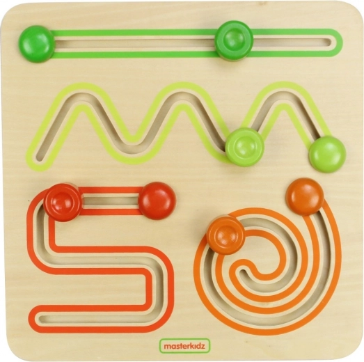 Táto montessori inšpirovaná posuvná tabuľa MASTERKIDZ podporuje prirodzené učenie hrou. Deti posúvajú farebné jazdce po štyroch typoch dráh, čím trénujú správne pohyby zápästí a prstov dôležité pre budúce písanie. Stabilný, hladko brúsený drevený materiál je príjemný na dotyk a láka k objavovaniu.