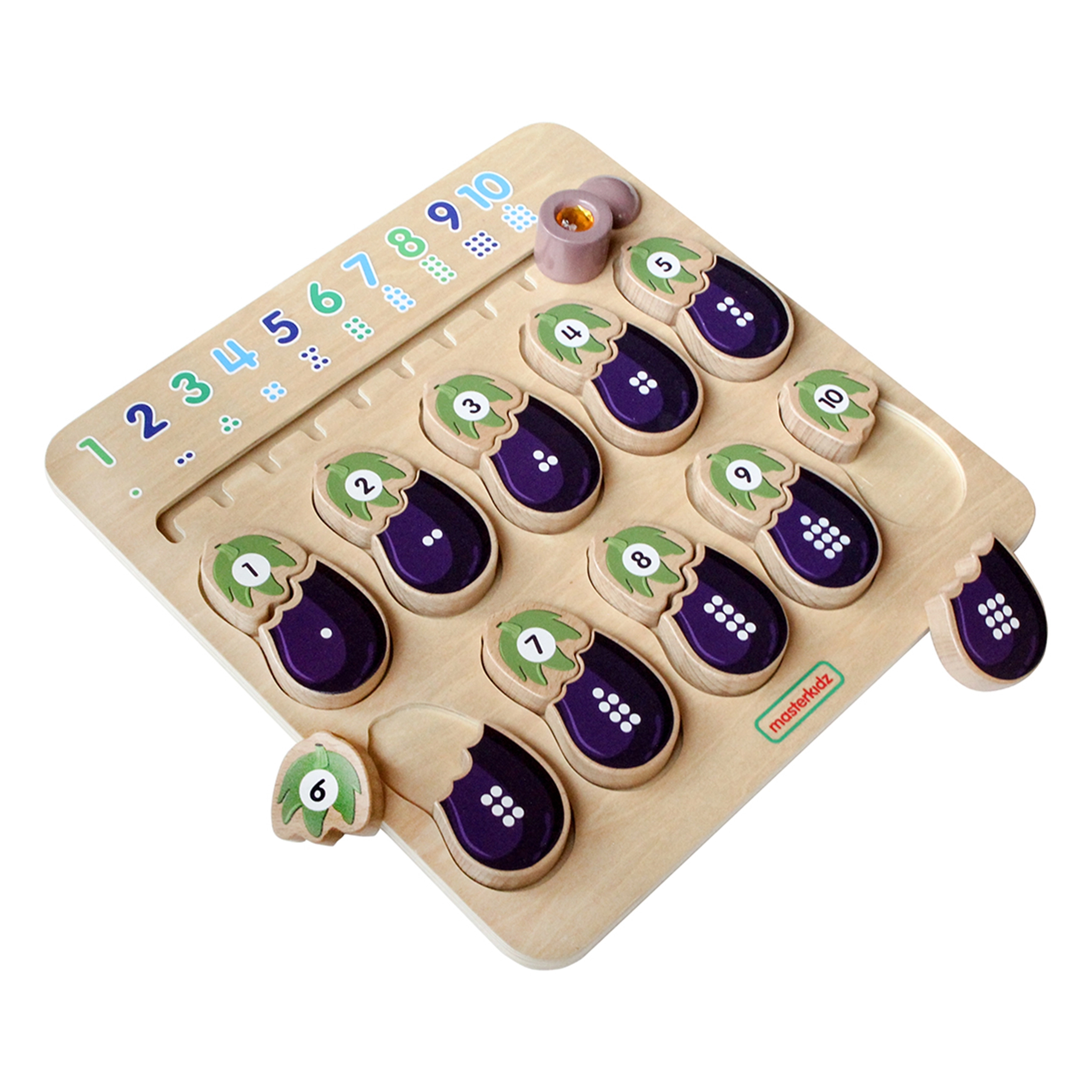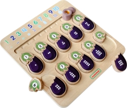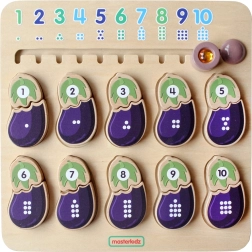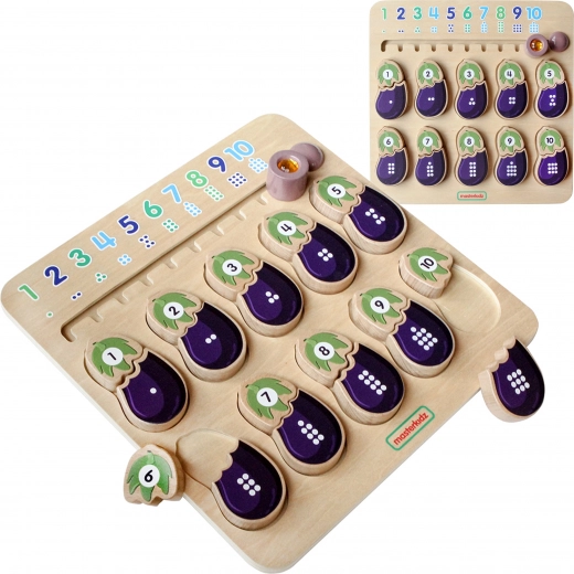 Drevená vzdelávacia tabuľa od značky MASTERKIDZ je navrhnutá pre deti na rozvoj ich zmyslov. Táto tabuľa pomáha deťom zoznámiť sa s číslami a farbami. Deti musia spojiť správne časti baklažánu dohromady – jedna časť predstavuje číslo a druhá zodpovedajúci počet bodiek. Hore je jazdec s číslami a bodkami v správnom poradí.