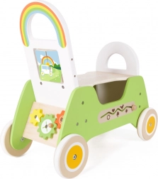 Vozík je lakovaný netoxickými farbami a vyrobený z prírodných materiálov inšpirovaných princípmi Montessori. Farebné detaily, tvarové aktivity a prevody (ozubené kolieska) podnecujú rozpoznávanie tvarov a farieb a podporujú logické myslenie.