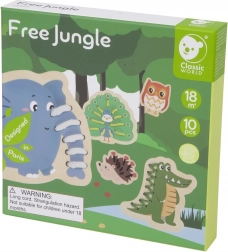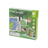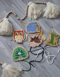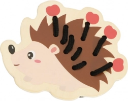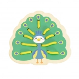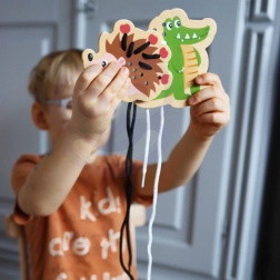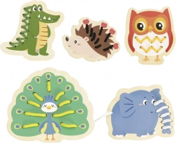 Táto drevená prevliekacia sada obsahuje päť veselých zvieratiek – slona, ježka, krokodíla, páva a sovu – a farebné šnúrky na ich prepletanie. Deti najprv priraďujú časti ako hlavu, nohy, uši či chvost k základni zvieratka a potom ich prepájajú povrázkom. Jednoduchá aktivita prináša veľa radosti a zároveň cielene posilňuje zručnosti dôležité pre predškolákov.