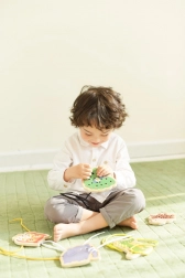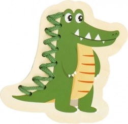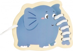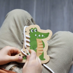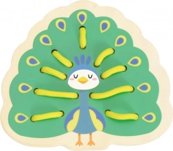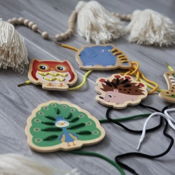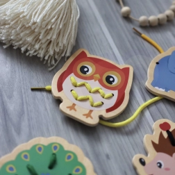 Predvŕtané otvory a farebné šnúrky vedú deti krok za krokom k presnému úchopu a tréningu trpezlivosti – ideálna aktivita pre predškolský vek.