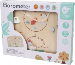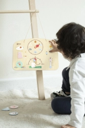 Táto chytrá a zábavná tabuľa deťom pomáha pochopiť, čo sa deje za oknom. Jednoduchým otáčaním a posúvaním prvkov deti samy nastavia aktuálne počasie a učia sa ho správne pomenovať. Vďaka pevnému drevenému prevedeniu a bezpečným, netoxickým farbám je tabuľa ideálna do detskej izby, škôlky aj na cestovanie.