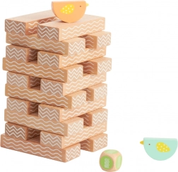 Súčasťou je kocka s motívmi, ktoré pridávajú do hry náhodu a súťaživosť – kto postaví vežu vyššie, bez toho aby spadla?