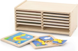 Všetky dieliky sú vyrobené z lakovaného dreva a maľované netoxickými farbami, ktoré sú bezpečné pre deti. Súčasťou sady je aj drevený stojan na uskladnenie dosiek, čo pomáha udržiavať poriadok v hernom priestore.