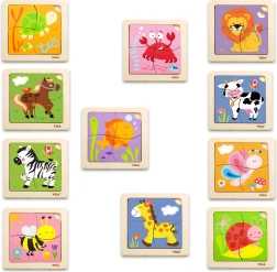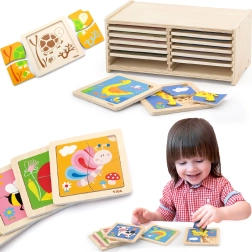 Každé puzzle obsahuje farebné ilustrácie zvierat, ktoré podporujú učenie a objavovanie.