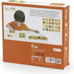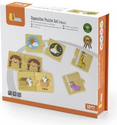 Drevené puzzle s protikladnými obrázkami VIGA obsahujú 24 farebných dielikov, ktoré možno spojiť do protikladných párov. Táto hračka pomáha deťom rozvíjať slovnú zásobu, koncentráciu, motorické schopnosti a logické myslenie prostredníctvom spájania a objavovania vzťahov.