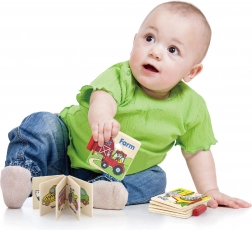 Drevené strany so zaoblenými hranami a povrch upravený netoxickými farbami. Pevná červená šnúrka drží knižku pohromade a uľahčuje listovanie.