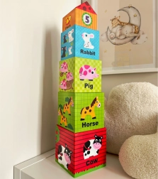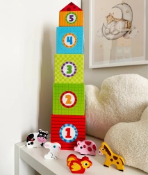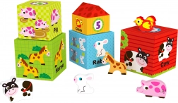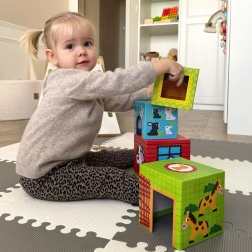 Očíslované kocky s jasnými ilustráciami učia dieťa rozlišovať veľkosti, počítať a zoznamujú ho s anglickými názvami zvierat – prirodzene, počas hry.