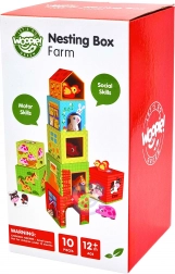 Skladacie kocky WOOPIE GREEN Farma spájajú kreatívne stavenie s chytrou výukou. Každý box predstavuje iný domček od najmenšej sliepočky po najväčšiu kravičku, je očíslovaný a ilustrovaný tak, aby dieťa ľahko chápalo veľkosti, poradie a počítanie. Vďaka otvorom môžu deti schovávať zvieratká dovnútra a vytvárať svoje vlastné farmárske príbehy.