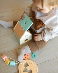 Drevený sorter s vekom a výrezmi povzbudzuje deti k rozpoznávaniu tvarov a farieb a posilňuje koordináciu oko–ruka aj priestorovú predstavivosť.