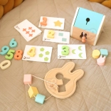 - drevený sorter tvarov, číslice s kartičkami, kocky, prevliekacia hra v tvare zajačika