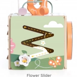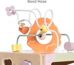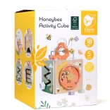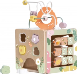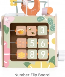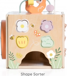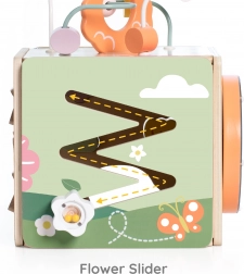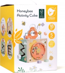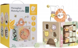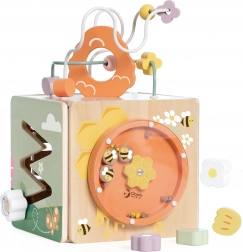 Objavte čaro drevenej kocky, ktorá ponúka päť rôznych aktivít v jednom. Deti tu nájdu otočné kocky s číslami a obrázkami, guľôčkový labyrint, posuvné lišty, geometrické tvary a otáčajúce koliesko s včelami. Každý prvok kocky je navrhnutý tak, aby stimuloval zvedavosť a rozvíjal zručnosti detí.