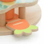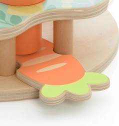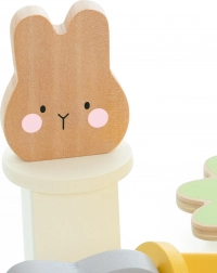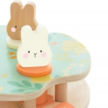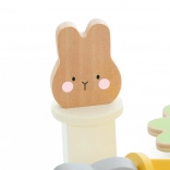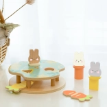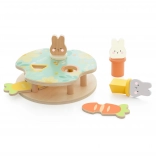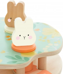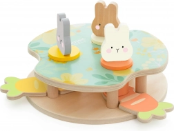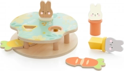 Hračka obsahuje tri farebné králiky, ktoré dieťa vkladá do platforiem podľa tvaru a farby. Stlačenie mrkvy spôsobí ich vykuknutie!