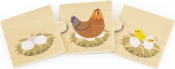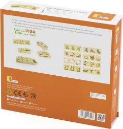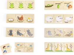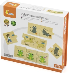 Zábavná a vzdelávacia sada drevených puzzle od značky VIGA učí deti priraďovať činnosti zvierat do správnej postupnosti. Obsahuje 24 drevených dielikov tvoriacich 8 logických sekvencií (napr. aportovanie psa alebo žirafa, ktorá si trhá listy zo stromu). Podporuje logické myslenie, slovnú zásobu, koncentráciu, jemnú motoriku aj zrakovú koordináciu a je vhodná už od 18 mesiacov.