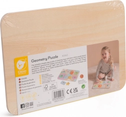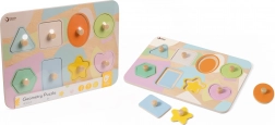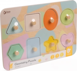 Táto krásna drevená skladačka ponúka mnoho možností pre výučbu a zábavu. Sada obsahuje deväť dielikov s rôznymi geometrickými tvarmi, ktoré sú maľované v príjemných pastelových farbách. Deti sa učia rozpoznávať tvary a farby tým, že spojujú jednotlivé dieliky s odpovedajúcimi otvormi na doske.