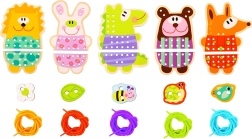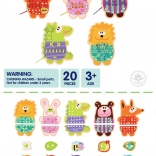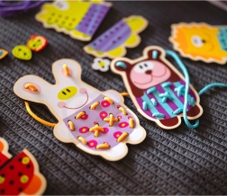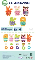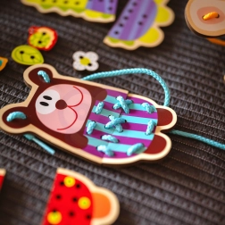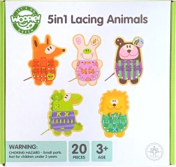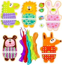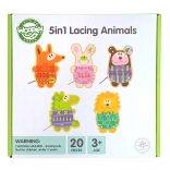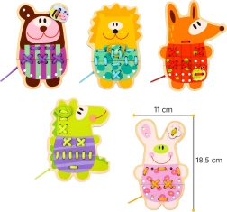 - 5 drevených šnurovacích zvieratiek, 5 prvkov k „prišívaniu“, 5 farebných šnúrok na navliekanie