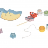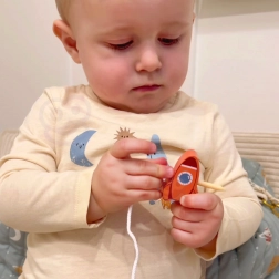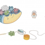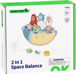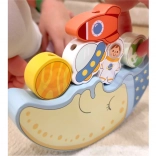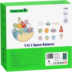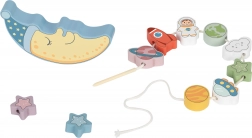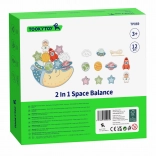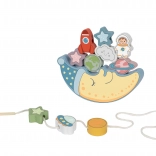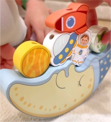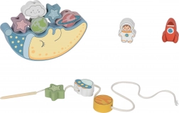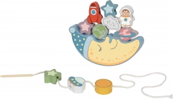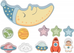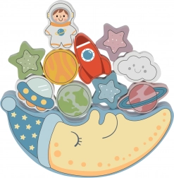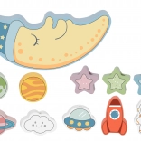 Prvou časťou sady je balansujúca výzva: deti sa pokúšajú umiestniť 10 farebných blokov – raketu, astronauta, hviezdy, UFO, planéty a veselý oblak – na spiacu tvár mesiaca, snažiac sa, aby konštrukcia nespadla. To je skvelá príležitosť na cvičenie presnosti a trpezlivosti.
