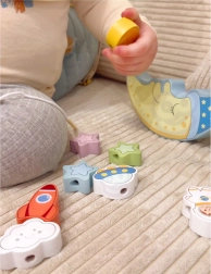 Druhá časť ponúka kreatívnu hru na navliekanie: bloky možno navliekať pomocou drevenej ihly a šnúrky, čo pomáha rozvíjať jemné motorické zručnosti a koordináciu rúk a očí.