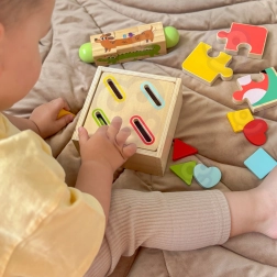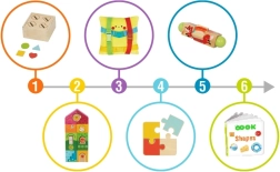 Šesť vzdelávacích aktivít v jednom boxe rozvíja jemnú motoriku, koordináciu oko–ruka, logické uvažovanie aj rozpoznávanie tvarov a farieb – s dôrazom na samostatnosť dieťaťa.