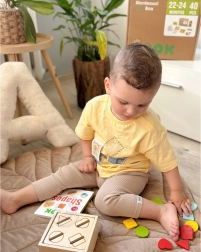 - Tvarový sorter (16 dielikov/4 tvary), vankúš s prackami, stohovacia veža (5 úrovní, 15 dielikov), otáčacia skladačka so zvieratkami, obojstranné puzzle, knižka o tvaroch