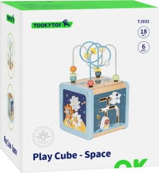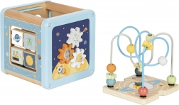 Drevená aktívna kocka s motívom vesmíru od značky Tooky Toy prináša deťom od 18 mesiacov hodiny zábavy aj učenia. Ponúka labyrint s korálikmi, triedenie tvarov, otáčacie obrázkové kocky, farebné ozubené kolieska a posuvné prvky, ktoré rozvíjajú jemnú motoriku, koordinačné schopnosti aj logické myslenie. Vďaka pastelovým farbám a premyslenému dizajnu je kocka zároveň krásna aj ľahko skladovateľná – hornú časť s labyrintom možno schovať dovnútra.