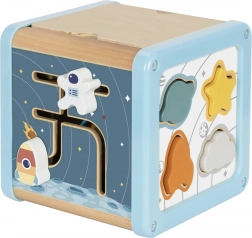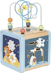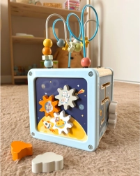 Objavte multifunkčnú drevenú aktívnu kocku s témou vesmíru, ktorá podporuje prirodzený rozvoj dieťaťa. Deti si zamilujú posúvanie korálikov v labyrinte, otáčanie obrázkových blokov s raketou, planétou a kozmonautom, triedenie tvarov aj točenie farebných ozubených kolies. Každá strana ponúka inú činnosť na rozvoj jemnej motoriky, oko–rukovej koordinácie a zvedavosti.