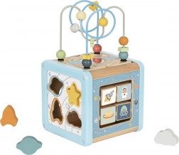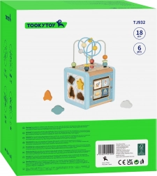 Farebné koráliky na kovových vodičoch rozvíjajú koordináciu oko–ruka a trpezlivosť. Hornú časť s labyrintom môžete schovať dovnútra kocky pre jednoduché skladovanie.