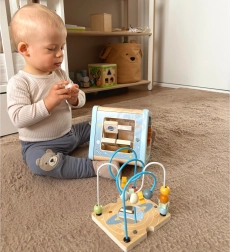 - 5 aktivít v 1: labyrint s korálikmi, triedenie tvarov, ozubené kolá, posuvné prvky, otáčacie obrázky