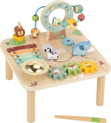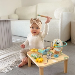 Objavte kvalitný drevený activity stolík, ktorý deti prirodzene vedie k objavovaniu. Vďaka rôznorodým herným zónam – od hudobného xylofónu cez ozubené kolieska až po guľôčkový labyrint – si deti precvičia koordináciu, presnosť pohybu aj vnímanie príčin a následkov. Pevná drevená konštrukcia a jemné pastelové farby skvele zapadnú do detskej izby.