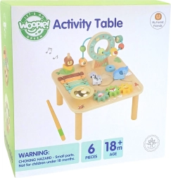 Multifunkčný drevený stolík 5v1 od značky WOOPIE GREEN spája zábavu a učenie v jednom. Ponúka xylofón, guľôčkový labyrint, ozubené kolieska, triedenie tvarov a stavebné/prevliekacie prvky. Podporuje jemnú motoriku, koordináciu oko–ruka, logické myslenie a zmyslové vnímanie. Vyrobený z prírodného dreva v pastelových farbách a bezpečných náteroch, ideálny pre deti od 18 mesiacov.