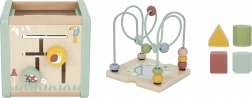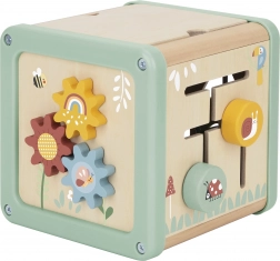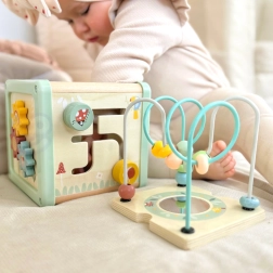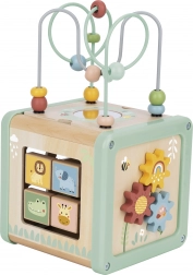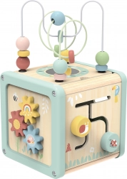 Horná časť kocky ponúka farebné koráliky na posúvanie po zakrivených drôtikoch, ktoré rozvíjajú koordináciu a jemnú motoriku. Zrkadielko podnecuje zvedavosť a vnímanie seba samého.