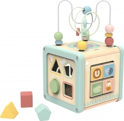 Táto multifunkčná drevená kocka podporuje prirodzený rozvoj dieťaťa prostredníctvom zmysluplnej hry. Pastelové farby priťahujú pozornosť, zatiaľ čo rozmanité aktivity trénujú jemnú motoriku, koordináciu oko–ruka, logické myslenie a rozpoznávanie tvarov a farieb.