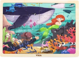 Detské puzzle VIGA – Tajomstvá mora prinášajú farebnú podmorskú ilustráciu so syrénou, potápačom, rybkami, koralovým útesom aj potopenou loďou. Vďaka drevenému rámiku zostávajú dieliky pri skladaní na mieste a obrázok podkladovej dosky slúži ako jasná predloha.