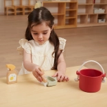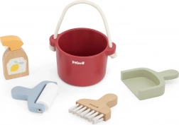 - Kompletná výbava na hranie sa na upratovanie: metla/metlička so špachtľou, drevený rozprašovač, valček na nečistoty a červené vedro.