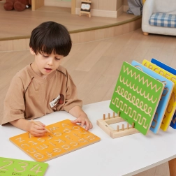 Stojan je vybavený praktickými kolíkmi na stabilné zasunutie jednotlivých dosiek, takže každá tabuľa alebo puzzle má svoje miesto. Kapacita až 10 kusov uľahčuje rotáciu hier a aktivít a zároveň umožňuje efektívnu organizáciu a atraktívnu prezentáciu.