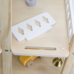 Praktická garáž s dreveným autíčkom a ďalšími doplnkami rozširuje herné možnosti a podporuje hru na role.