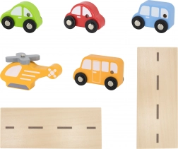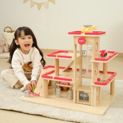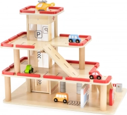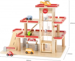 Súčasťou balenia sú 4 drevené autíčka, vrtuľník a prvky vjazdu a zjazdu. Jasné označenie parkovacích miest, umyvárka a zábrany podporujú realistické scenáre a učia deti koordinačným zručnostiam.