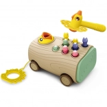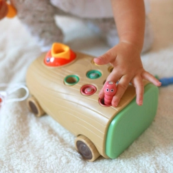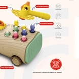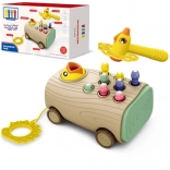 Táto interaktívna hračka rastie s dieťaťom: od prvých krôčikov ako ťahací vozík s hladkým chodom, cez zatĺkanie červíkov bezpečným kladivkom, až po magnetické chytanie skrytých dielikov pomocou vtáčika s magnetom. Podnecuje sústredenie, trpezlivosť a rozvoj zmyslového vnímania.