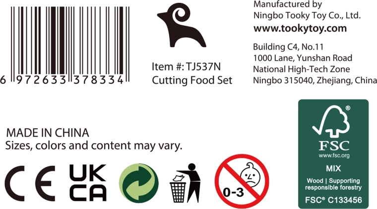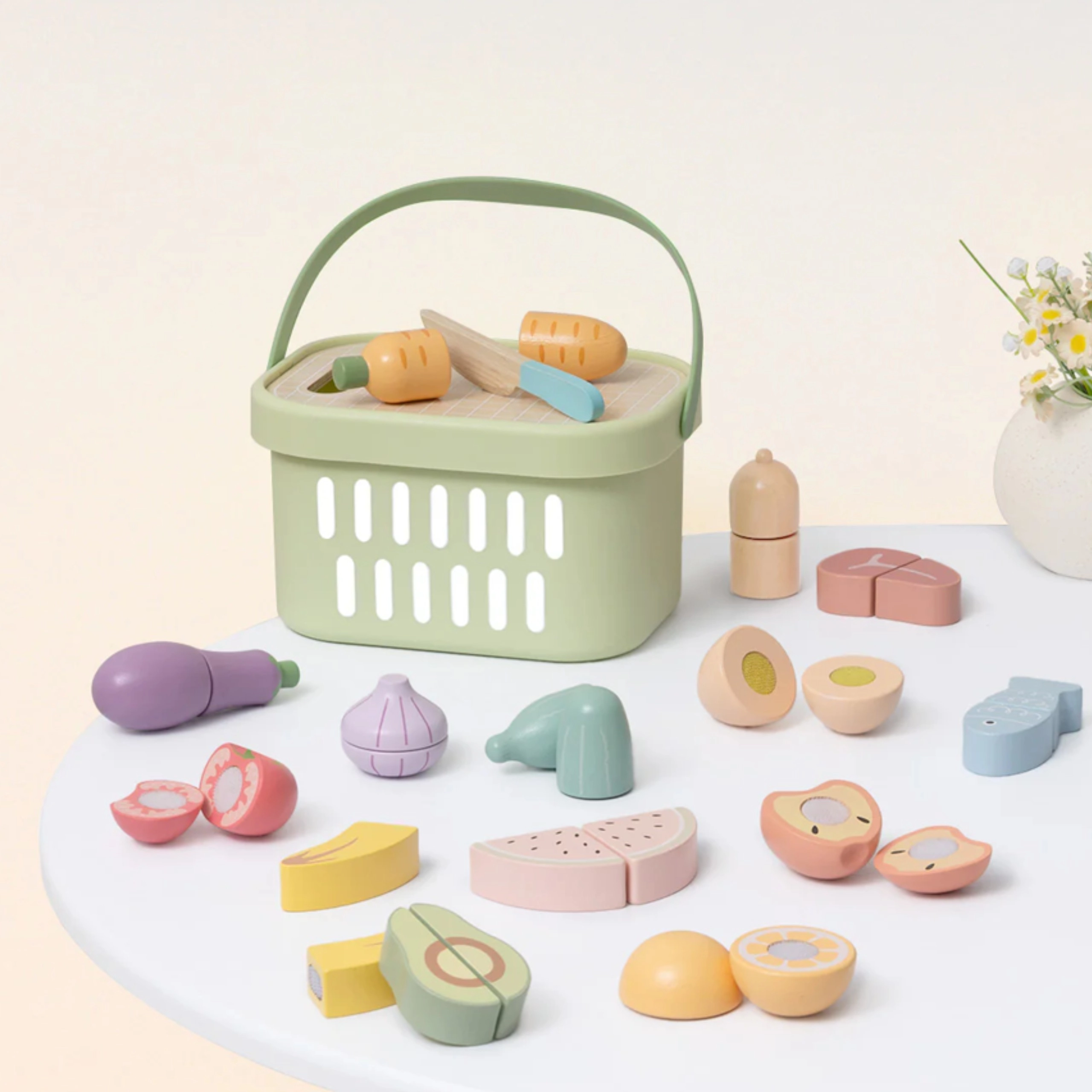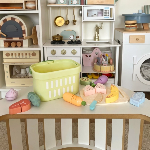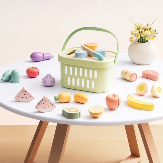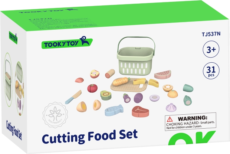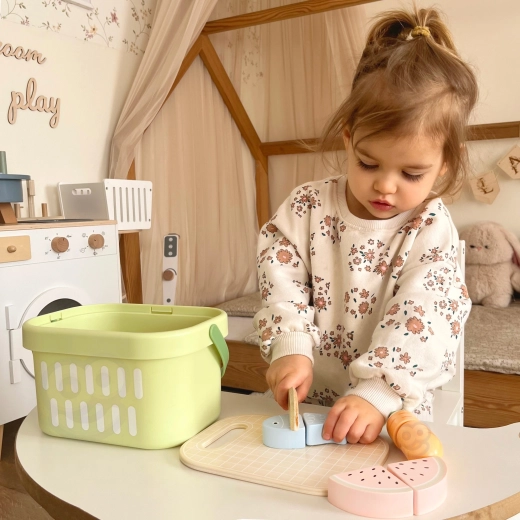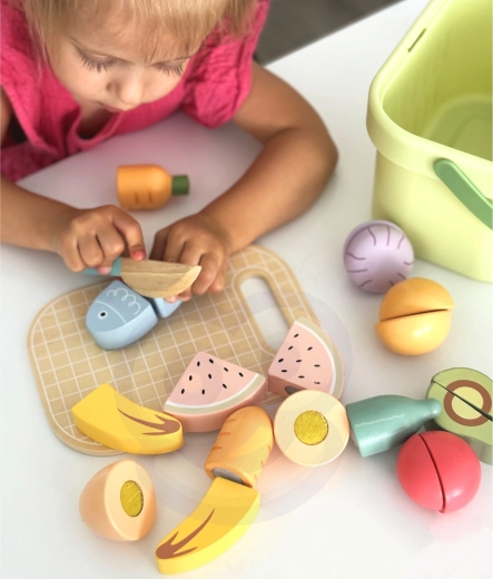 Drevená sada potravín TOOKY TOY je ideálna pre malú domácu kuchynku. Pastelové ovocie a zelenina, ryba, steak, syr či vajíčko sú rozdelené na časti a prepojené suchým zipsom – deti ich môžu bezpečne „krájať“ dreveným nožom na priloženej doske a znova skladať. Všetko uložia do ľahkého košíka, takže je set ľahko prenosný a vždy uprataný.