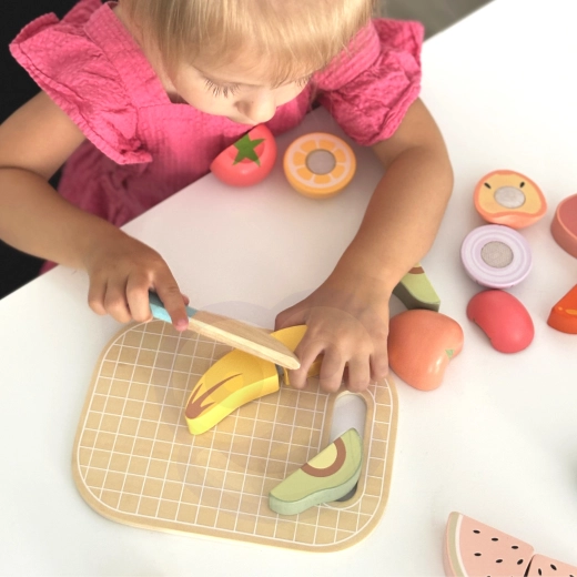 Diely ovocia a zeleniny sú segmentované a spojené suchým zipsom. Deti ich môžu opakovane „krájať“ dreveným nožom na doske a znova skladať.