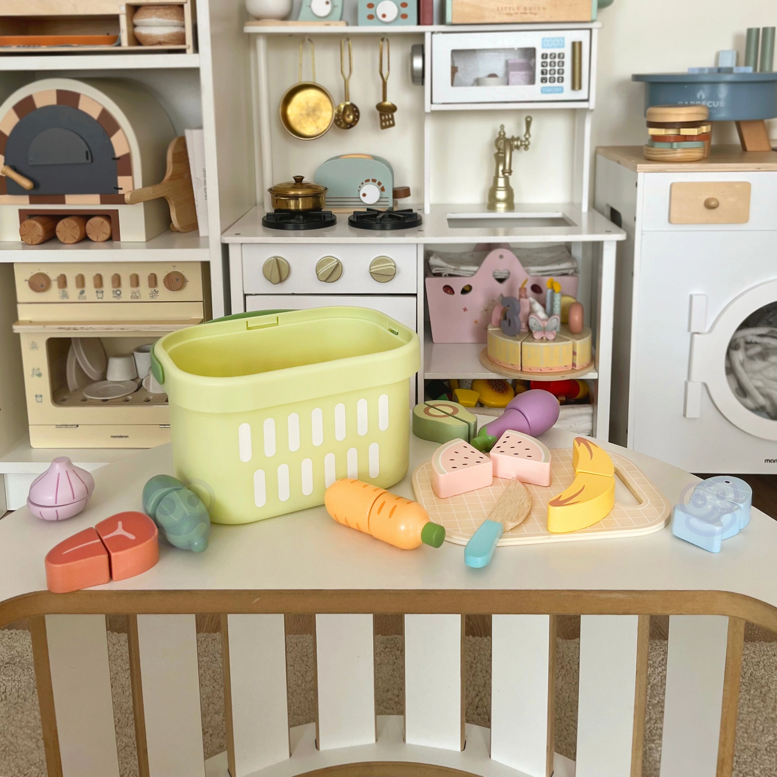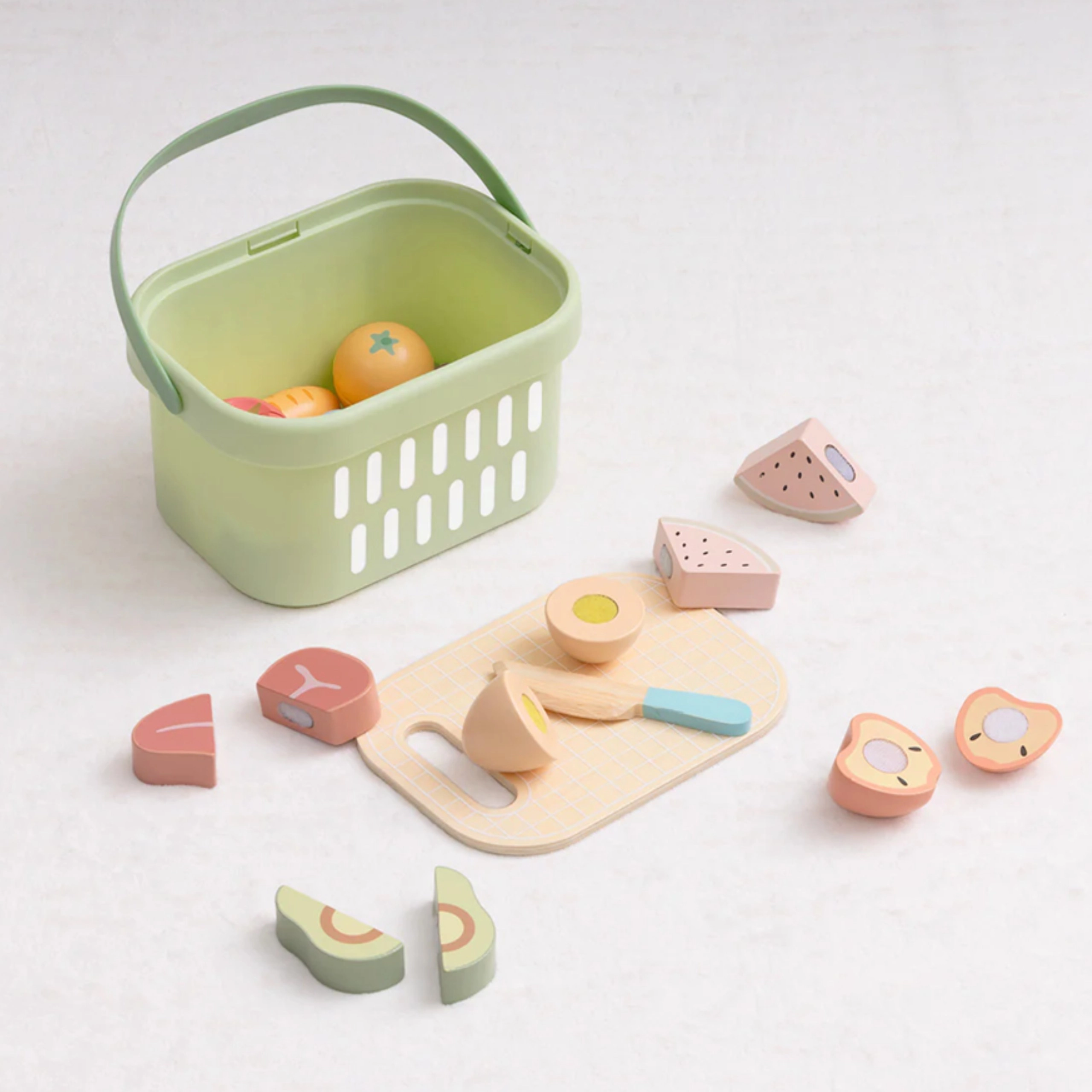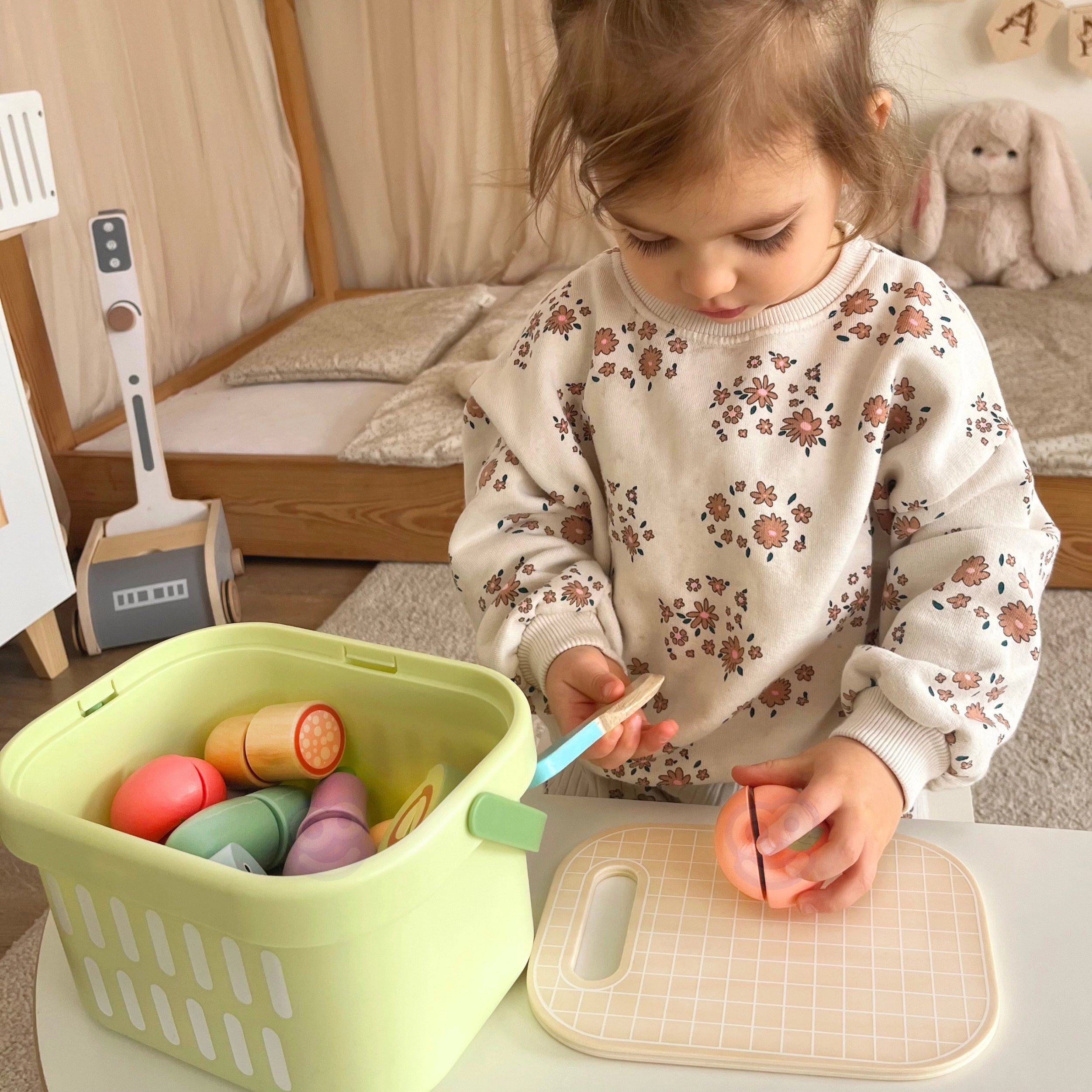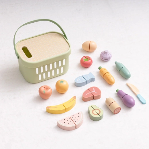 Košík, doska, nôž a pestrý výber potravín poskytujú všetko na varenie, servírovanie aj učenie o zdravej výžive.