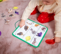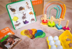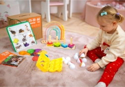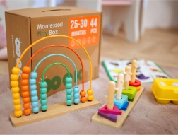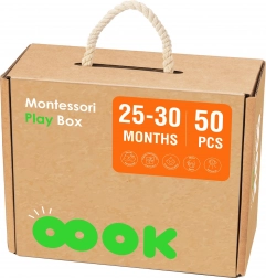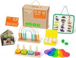 Vzdelávací box obsahuje niekoľko aktivít, ako je triedenie tvarov, zvieracie puzzle a farebné optické dosky, ktoré rozvíjajú zrakovú predstavivosť a manuálnu zručnosť. Ďalšie aktivity sú napríklad počítadlo s dúhou, ktoré učí malú matematiku, a Montessori guľôčková dráha, ktorá zdokonaľuje koordináciu očí a rúk. K dispozícii sú tiež knihy, ktoré pomáhajú deťom pochopiť vzťahy medzi veľkým a malým, rovnako ako mnoho ďalších kreatívnych cvičení.