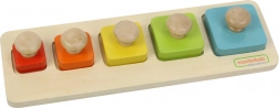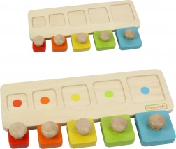 Drevená vzdelávacia hračka pre deti od 2 rokov, ktorá zahŕňa päť rôznofarebných štvorcových blokov s úchytmi, uľahčujúcimi ich umiestnenie do vyrezaných otvorov na drevenej základni. Každý blok je opatrený drevenou rukoväťou, čo zjednodušuje ich uchopenie.