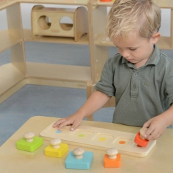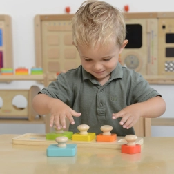 Drevená vzdelávacia hračka inšpirovaná metodikou Montessori je ideálna pre rozvoj jemnej motoriky, senzorických schopností a koordinácie ruka-oko u detí. Skladá sa z päťky štvorcových blokov v rôznych farbách a veľkostiach, ktoré dieťa zasadzuje do zodpovedajúcich miest na dvojstrannej základni: jedna strana obsahuje farebné bodky pre ľahšie zhodovanie, druhá strana iba vyrezané otvory pre zvýšenie obtiažnosti.