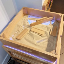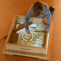 Pre ešte väčší efekt možno rám doplniť o voliteľný svetelný LED panel, ktorý napájate cez Micro USB a pohodlne ovládate diaľkovým ovládačom. Panel umožňuje nastaviť zložky RGB (červená, zelená, modrá) a vybrať si z 3 režimov: slučka dúhových farieb, efekt búrky s bleskami a slučka upokojujúcich farieb. Panel je navrhnutý tak, aby ladil s multifunkčným stolíkom Masterkidz na kolieskach.