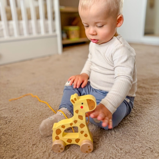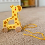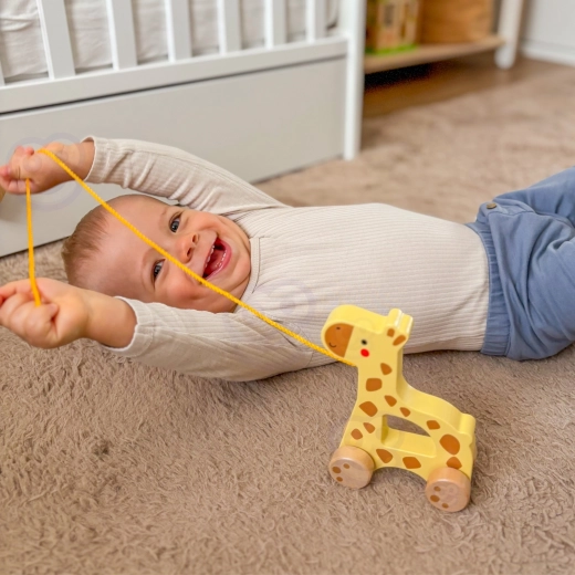 Žirafa je vyrobená z zodpovedne získaného dreva a natretá bezpečnými farbami. Hra s ťahacou hračkou prirodzene rozvíja koordinačné schopnosti, rovnováhu a sústredenie, a motivuje deti k chôdzi a aktívnej hre.